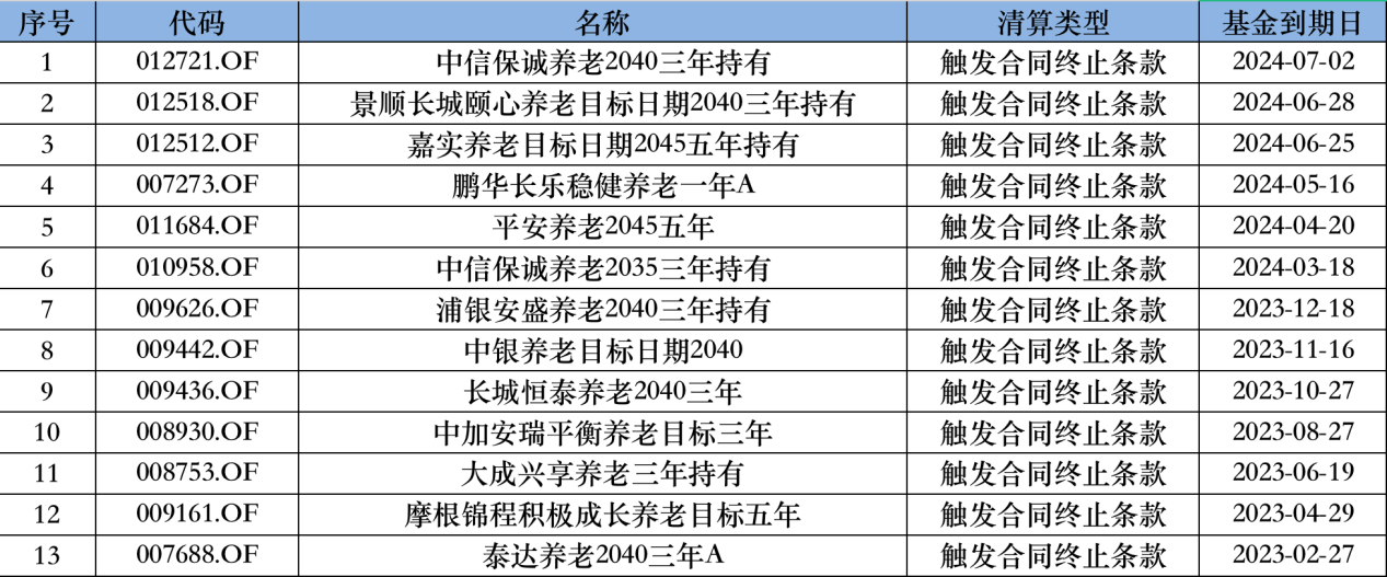 2024年以来,已有6只养老FOF清盘,均为发起式,清盘原因主要都是规模未能达到2亿元而触发清盘条款。