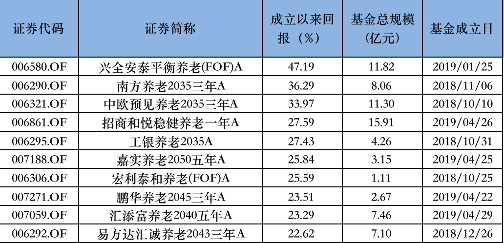 成立以来回报居前10的养老FOF均为2018年、2019年间成立,林国怀管理的兴全安泰平衡养老FOF成立以来总回报47.19%,居首。包括南方、中欧、工银瑞信、宏利基金等多家产品收益靠前。