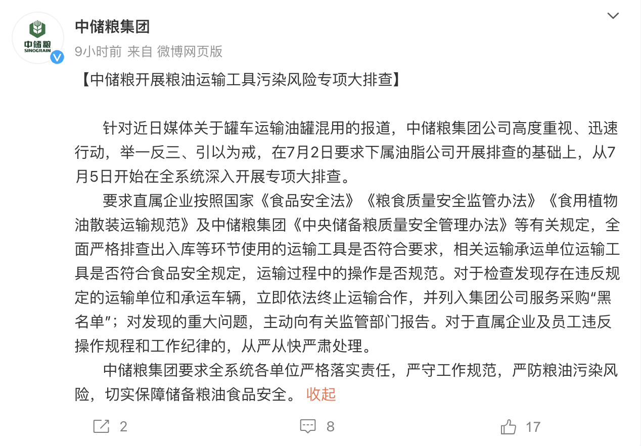 中储粮集团7月6日发文表示,针对近日媒体关于罐车运输油罐混用的报道,中储粮集团公司高度重视、迅速行动,举一反三、引以为戒,在7月2日要求下属油脂公司开展排查的基础上,从7月5日开始在全系统深入开展专项大排查。