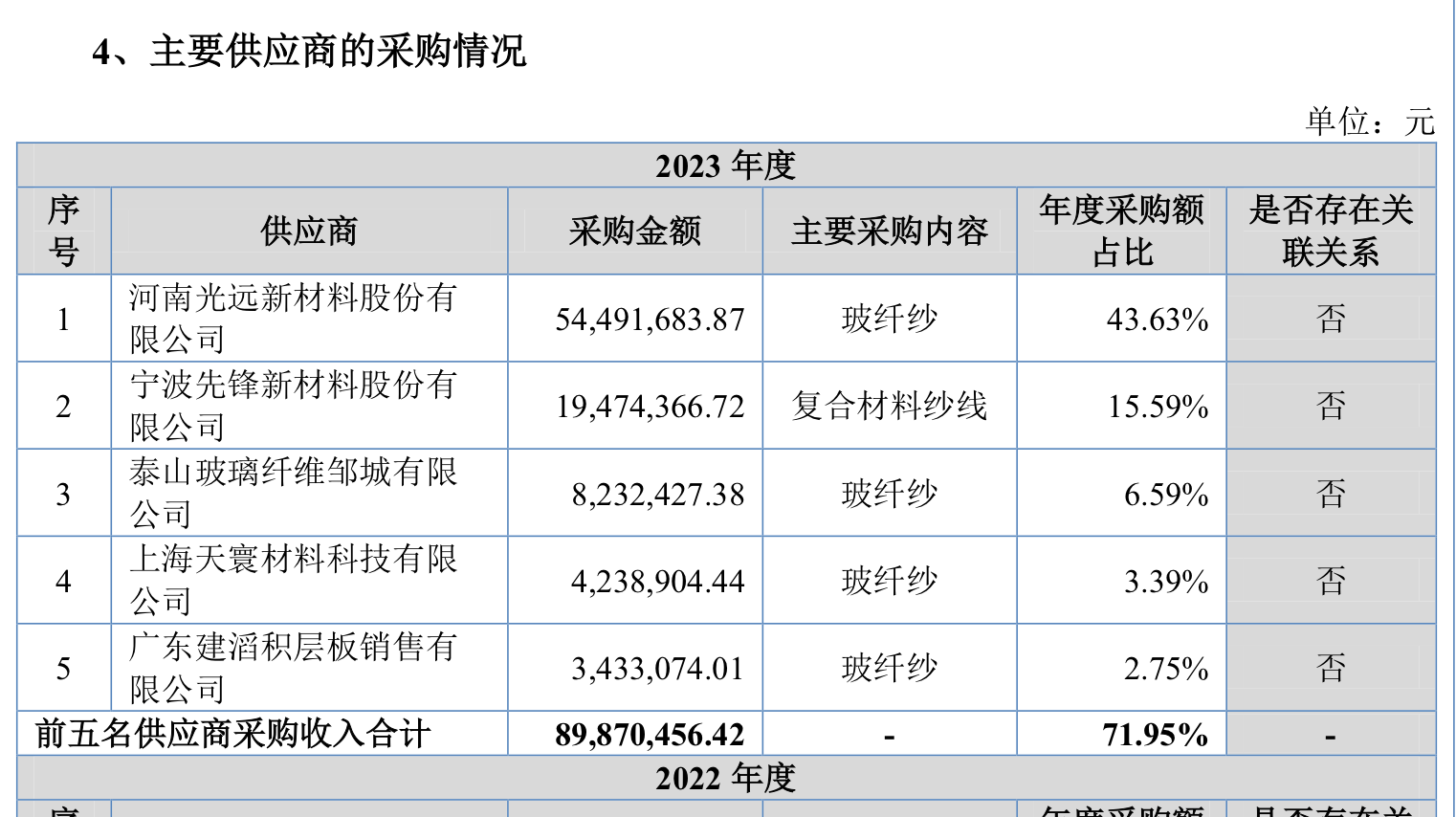 根据说明书,杰特新材的主要原材料为玻纤纱、化纤纱、浆料等,经过多年的发展,采购渠道趋于稳定,规模较大的供应商如泰山玻纤、中国巨石、河南光远、国际复材等。公司产品直接材料成本占主营业务成本的比例达到65.41%。