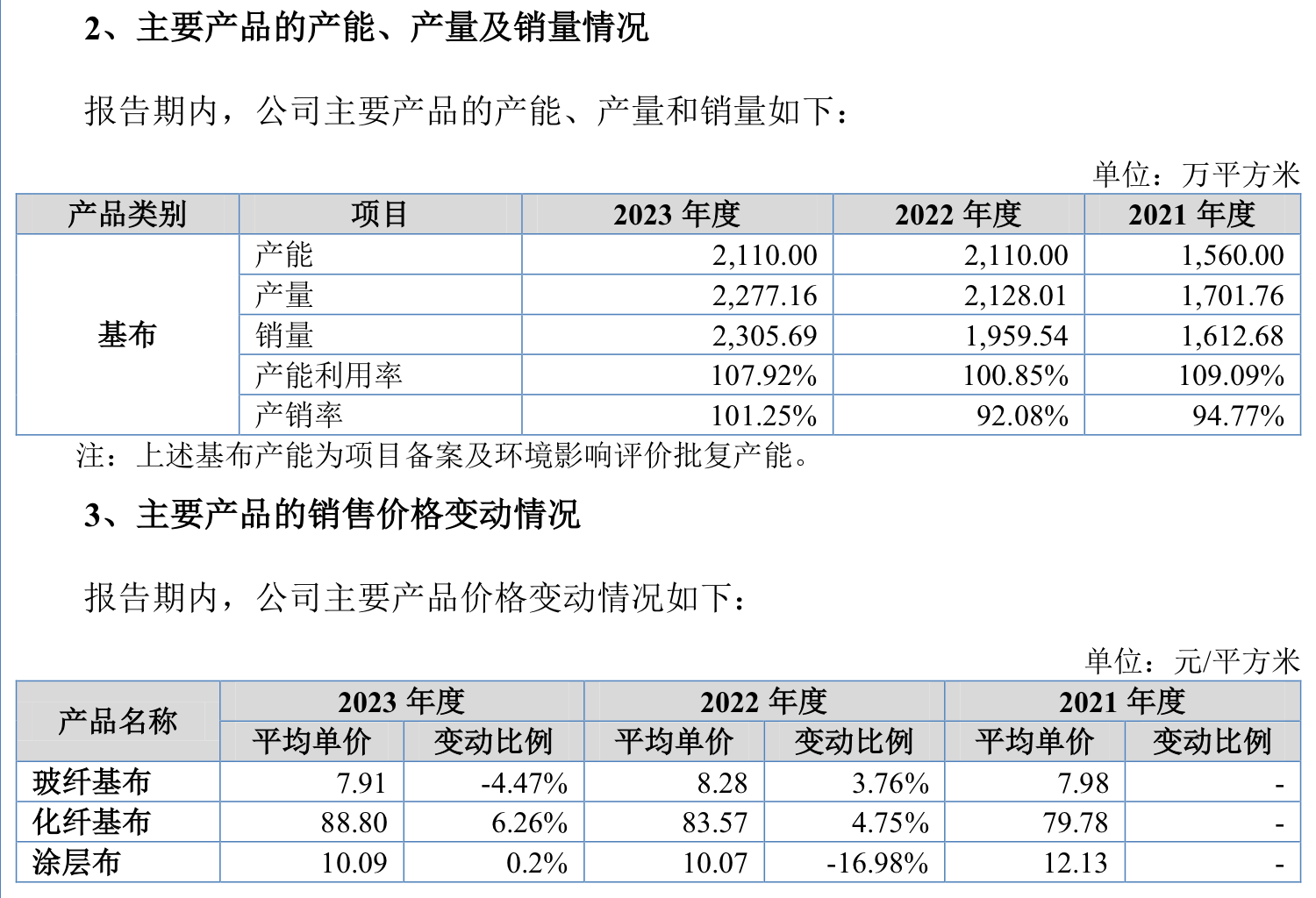 具体看,杰特新材生产的玻纤基布营收占比64.19%,化纤基布1.1%,涂层布34.7%,其他品种布0.01%。这其中,基布2023年产能2110万平米,产量2277.16万平米,销量2305.69万平米,产能利用率达到107.92%,产销率101.25%。不过值得注意的是,玻纤基布2023年平均单价7.91元,同比有4.47%的下滑。
