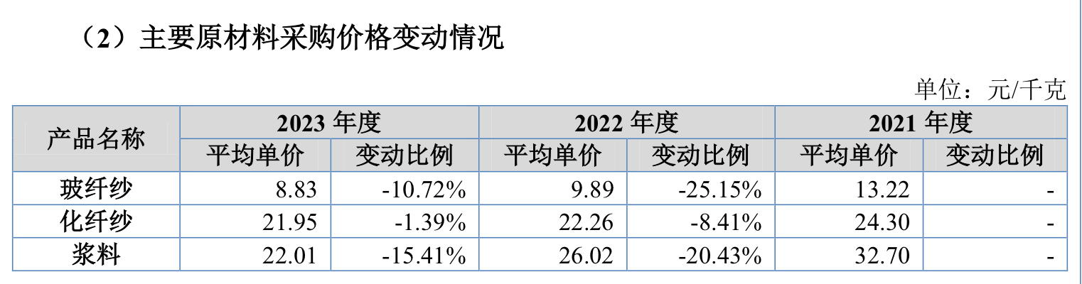 值得注意的是,玻纤纱、化纤纱、浆料近年来采购价格在下降,2023年玻纤纱均价8.83元/千克,变动比例-10.72%,化纤纱均价21.95元/千克,变动比例-1.39%,浆料均价22.01元/千克,变动比例-15.41%。这该是毛利率逐年提高的原因之一。