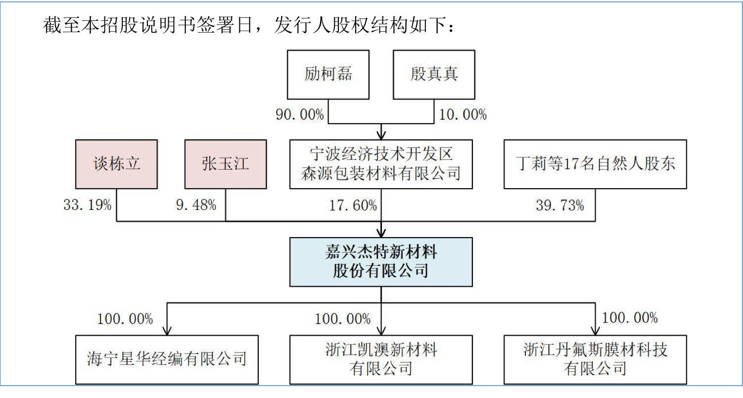 根据说明书,杰特新材控股股东、实际控制人为谈栋立、张玉江。谈栋立持有公司1131.67万股,占公司总股本的33.19%; 张玉江持有公司323.33万股,占公司总股本的9.48%。谈栋立、张玉江合计持有公司1455万股,占公司总股本的42.67%,二者签署了《一致行动人协议》。