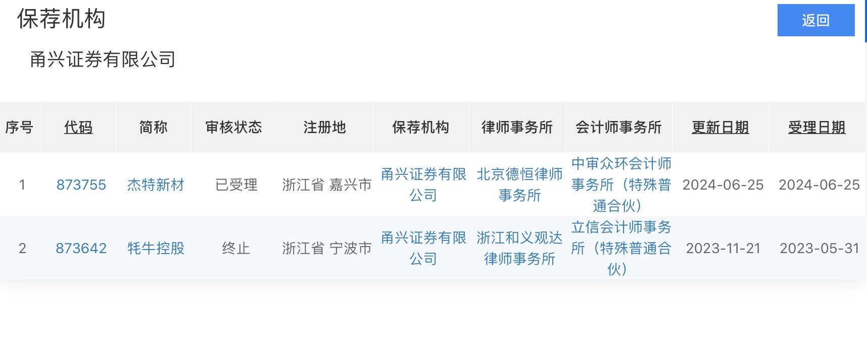 资料显示,杰特新材成立于2010年11月18日,注册资本3410万元,之前2022年7月20日,于全国中小企业股转系统挂牌,主办券商为甬兴证券,年报审计机构为中审众环会计师事务所(特殊普通合伙)。这是甬兴证券保荐的北交所项目第二单,此前牦牛控股(873642.NQ)已终止。