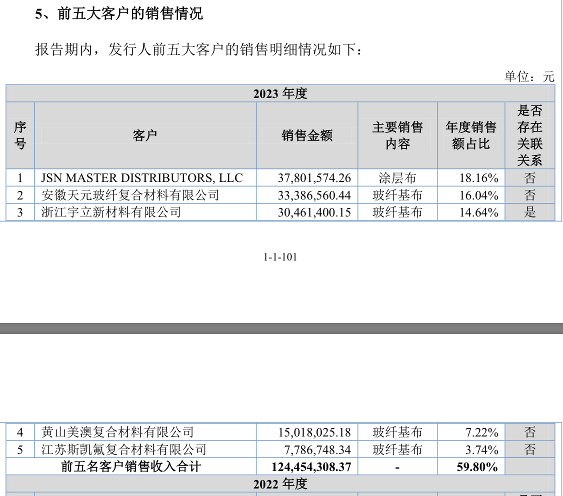 客户方面,杰特新材也有一定的集中度。2023年前五客户合计销售收入占比达到59.8%,较2022年的63.28%有下降,但比例也仍然不低。其中第一大客户系JSN MASTER DISTRIBUTORS, LLC,比例为18.16%。