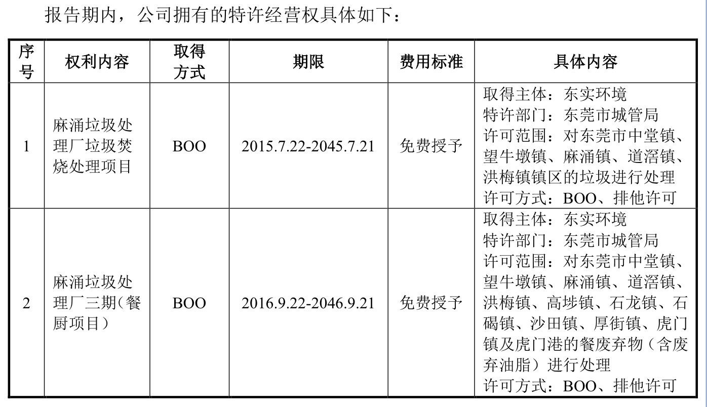 截至2023年12月31日,东实环境特许经营权项目中垃圾焚烧处理项目剩余约22年、餐厨垃圾处理项目剩余约23年。