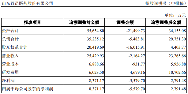 需要注意的是,百诺医药对其在新三板已披露的2021年度原始财务报表进行了调整。其中,该公司原披露其2021年营收是2.54亿元,此次调整下调2164.27万元至2.33亿元;同时其下调归母净利润数据从原来的8371.17万元至2791.48万元,下调额5579.7万元。
