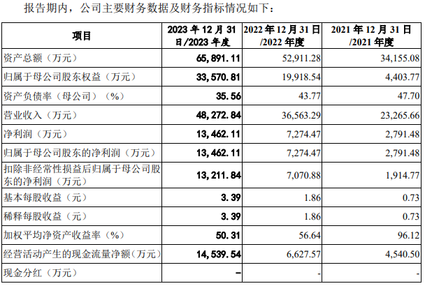 2021年至2023年,该公司货币资金余额分别为3973.21万元、13679.59万元及17411.14万元,占流动资产比例分别为27.88%、47.16%及49.17%。报告期各期末,该公司银行存款金额分别为3961.33万元、13668.31万元及17089.13万元,占比分别为99.7%、99.92%及98.15%。