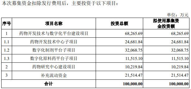 本次募集资金扣除发行费用后,该公司主要投资于药物开发技术与数字化平台建设项目(6.83亿元)、药物研究中心建设项目(1.02亿元)以及补充流动资金(2.15亿元);其中药物开发技术与数字化平台建设项目包含药物开发技术中心子项目(2.47亿元)、数字化制剂平台子项目(3.21亿元)、数字化原料药平台子项目(1.15亿元)。