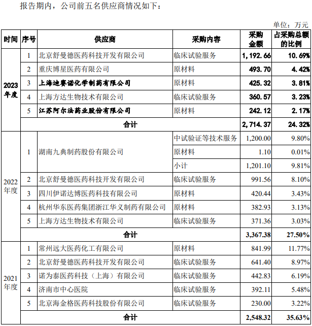 - 2021年,百诺医药客户、供应商重叠销售额较高,主要系2023年公司向益佰制药零星采购盐酸托莫西汀、木糖醇等原材料,因此益佰制药成为公司供应商。而2021年,百诺医药为益佰制药研发的盐酸托莫西汀口服溶液项目上市许可持有人变更完毕,公司一次性确认收入,因此2021年公司对该客户收入纳入重叠销售额统计范围内,使得2021年重叠销售额较高。