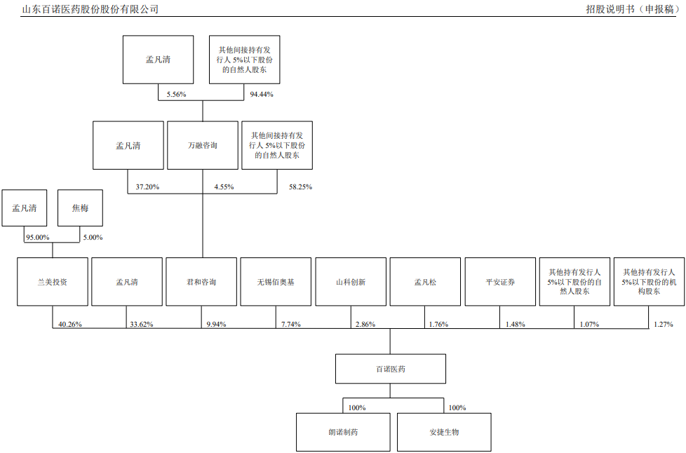 招股书显示,百诺医药实际控制人为孟凡清及焦梅夫妻二人,孟凡清直接持有公司13,361,100股,占公司股本总额的33.62%。此外,孟凡清和焦梅通过控制兰美投资控制公司股份15,999,000股,孟凡清通过控制君和咨询控制公司股份3,952,000股。夫妻二人控制的公司股份合计33,312,100股,占公司股本总额的83.82%。