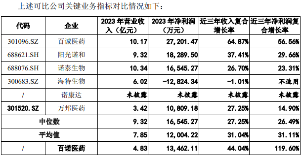 从主要企业的营业收入来看,上述主要企业的2023年收入均在3亿元至11亿元,2021年至2023年平均营收复合增长率为31.04%,整体呈现业绩高速增长的趋势。百诺医药2023年营收为4.83亿元,2021年至2023年营收复合增长率为44.04%,高于可比公司平均水平。