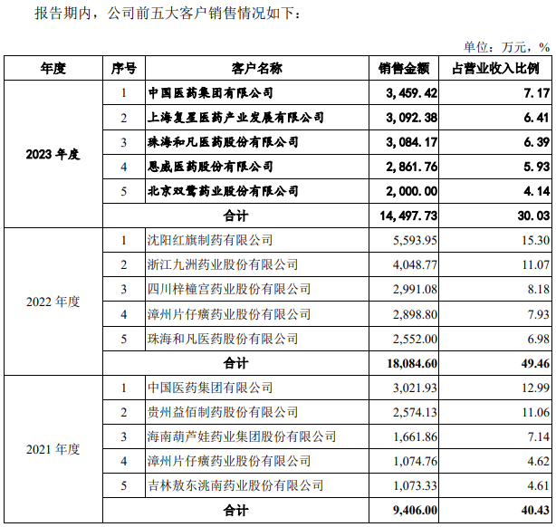 百诺医药招股书显示,2022年,沈阳红旗制药、九洲药业、梓橦宫、和凡医药成为公司前五大客户。2023年,中国医药集团、上海复星医药、双鹭药业和恩威医药成为公司前五大客户。