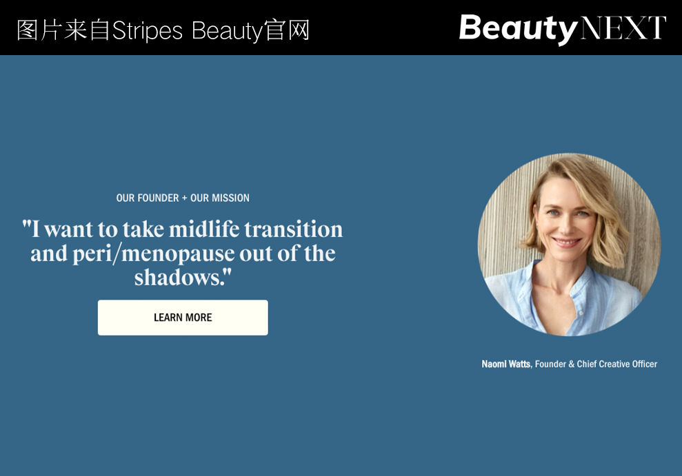 为了打破衰老的禁忌,55岁的好莱坞女演员娜奥米·沃茨在2022年创立了Stripes Beauty,主要为40-50岁处于更年期的女性,及其他因荷尔蒙变化造成身体不适的女性提供服务。