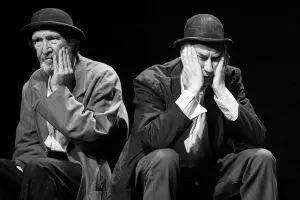 请你们试想一下“等待”的另外一个层面——那就是在每一天真实的等待中,岁月已经磨灭了你们的热情,你们提到戈多这俩字的时候,也许就只能提起一丝力气,一丝希望。你们在日复一日的等待中,想着法儿地消磨时间的痕迹,但是当所有游戏做完之后,要感觉到巨大的恐慌在降临。这恐慌也许是沮丧,也许是担心被更多的无聊控制,也许是涌上心头的无望。所以,在安静的时候,在只有你们两人的时候,应该是从内心里发出无望和颓废的声音,而不是互相提问,不是一问一答,更不是欢乐地逗贫嘴。提问,并不是在问对方,而是问自己,也许是问现实……我们在等谁?我们为什么不离开?我们是否还继续等下去?把提问的对象换成虚无,把提问的方式换成与自己的对话。