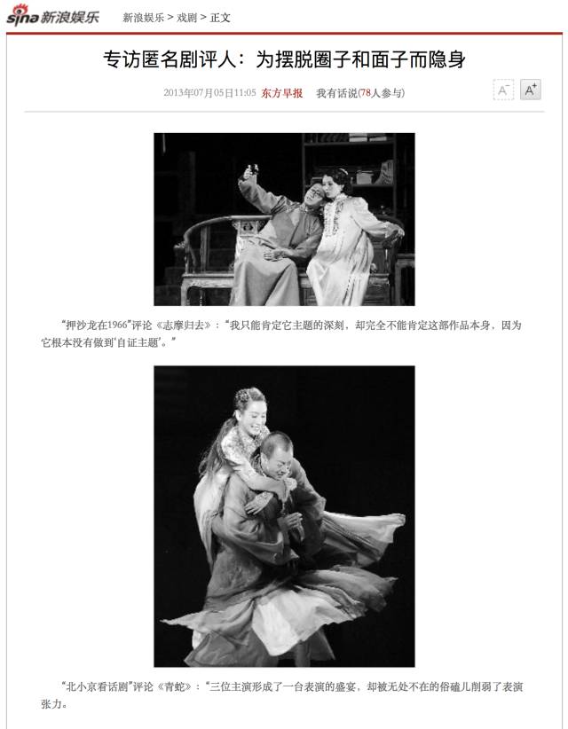 当然也有例外的剧评,而且是很重要的例外。近年来北京上海出现了两位颇有影响的“隐身”剧评家“北小京看话剧”和“押沙龙在1966”,他们的身份就引起了强烈的戏剧性悬念——在传统的人情世故使得评论家几乎没有可能和评论对象保持距离的情况下,隐身也许是保持独立性的最好办法。