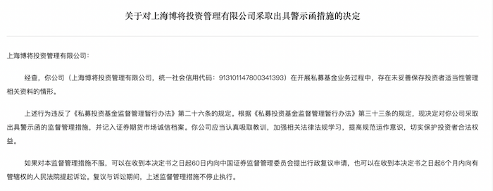 2022年8月31日,中国证监会上海监管局向博将控股发出了《出具警示函措施的决定》,直指博将控股在私募股权基金业务运营过程中存在未能妥善保存与投资者适当性管理相关的关键记录的问题。公司被采取出具警示函的监督管理措施,并被记入证券期货市场诚信档案。