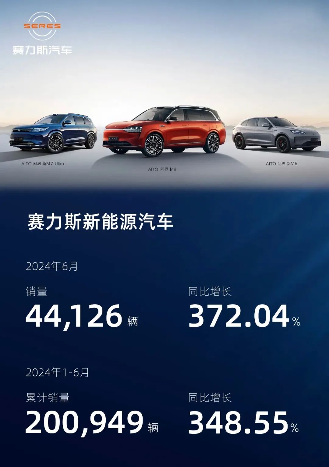 虽然与华为展开合作后,赛力斯增势不俗,销量上从2020年的700多台,跃迁到今年上半年的200949台,不到4年销量增长超2857%。