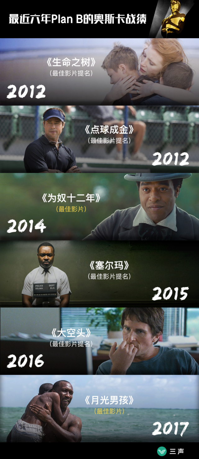 过去6年,一共有6部PlanB投资或制作的影片入围的奥斯卡最佳影片,从2013年开始已经连续四次入围,其中《为奴十二年》和《月光男孩》都笑到了最后。