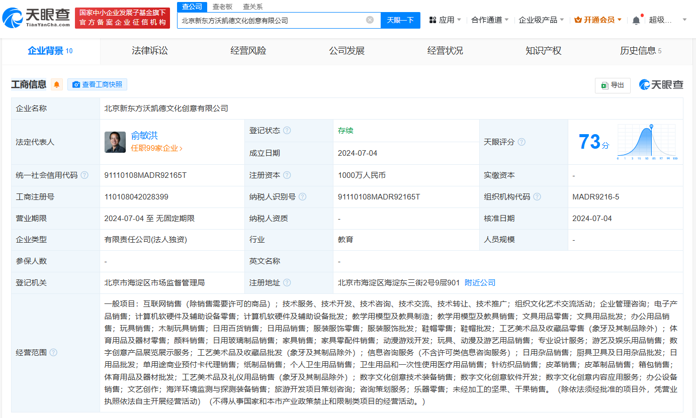 天眼查App显示,近日,北京新东方沃凯德文化创意有限公司成立,法定代表人、董事长为俞敏洪,注册资本1000万人民币,经营范围包括互联网销售、数字创意产品展览展示服务、数字文化创意软件开发、旅游开发项目策划咨询等。股东信息显示,该公司由北京新东方沃凯德国际教育旅行有限公司全资持股,后者为北京新东方文旅有限公司全资子公司。