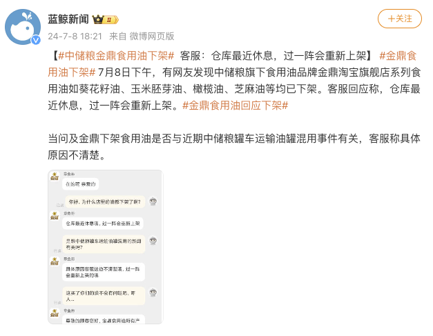 7月8日下午,有网友发现中储粮旗下食用油品牌金鼎淘宝旗舰店系列食用油如葵花籽油、玉米胚芽油、橄榄油、芝麻油等均已下架。客服回应称,仓库最近休息,过一阵会重新上架。当问及金鼎下架食用油是否与近期中储粮罐车运输油罐混用事件有关,客服称具体原因不清楚。(蓝鲸新闻)