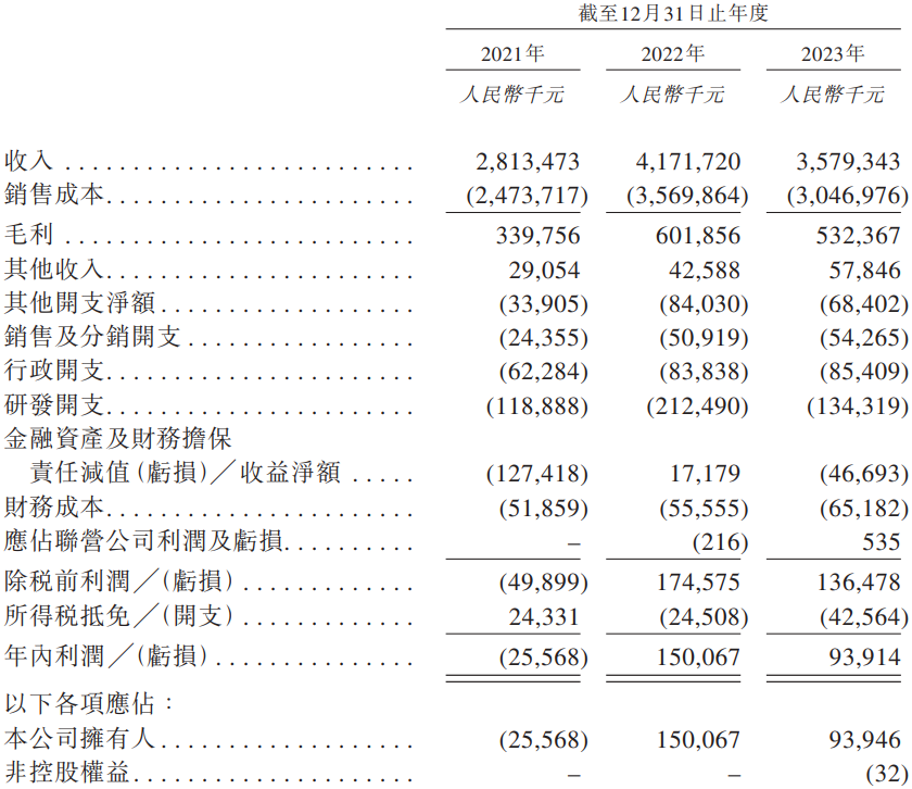财务数据显示,2021年、2022年及2023年(报告期内),正信光电实现收入分别为28.13亿元、41.72亿元及35.79亿元;毛利分别为3.4亿元、6.02亿元及5.32亿元,各有关期间的毛利率分别为12.1%、14.4%及14.9%。