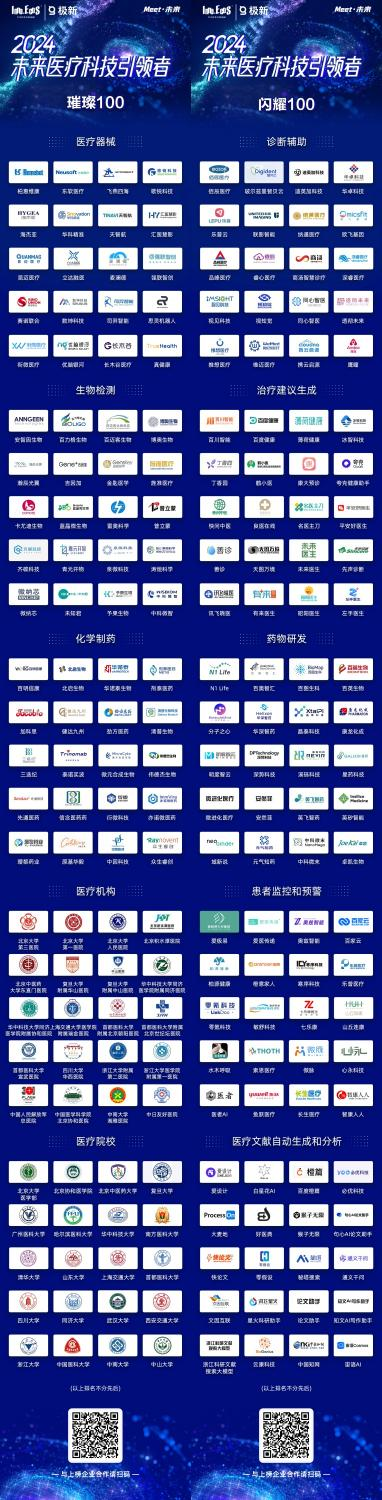 代表未来医疗科技引领者对《闪耀100》&《璀璨100》两大榜单也在2024未来医疗科技大会上重磅发布。该榜单自5月28日开启招募,历时一个月,由29位评委对218份报名问卷,并综合第三方数据平台的估值、知识产权、团队背景、客户案例等资料做出最终评分,于6月底全面完成资料整理及评委评审工作,可谓是2024年度医疗科技领域内的重磅排名。