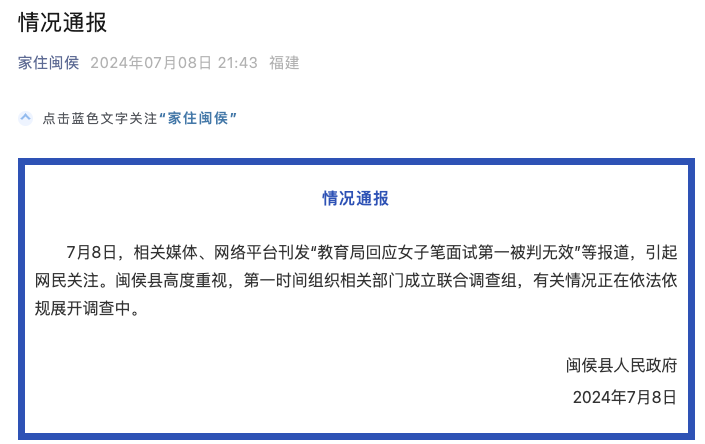 福建闽侯县人民政府通报,7月8日,相关媒体、网络平台刊发“教育局回应女子笔面试第一被判无效”等报道,引起网民关注。闽侯县高度重视,第一时间组织相关部门成立联合调查组,有关情况正在依法依规展开调查中。