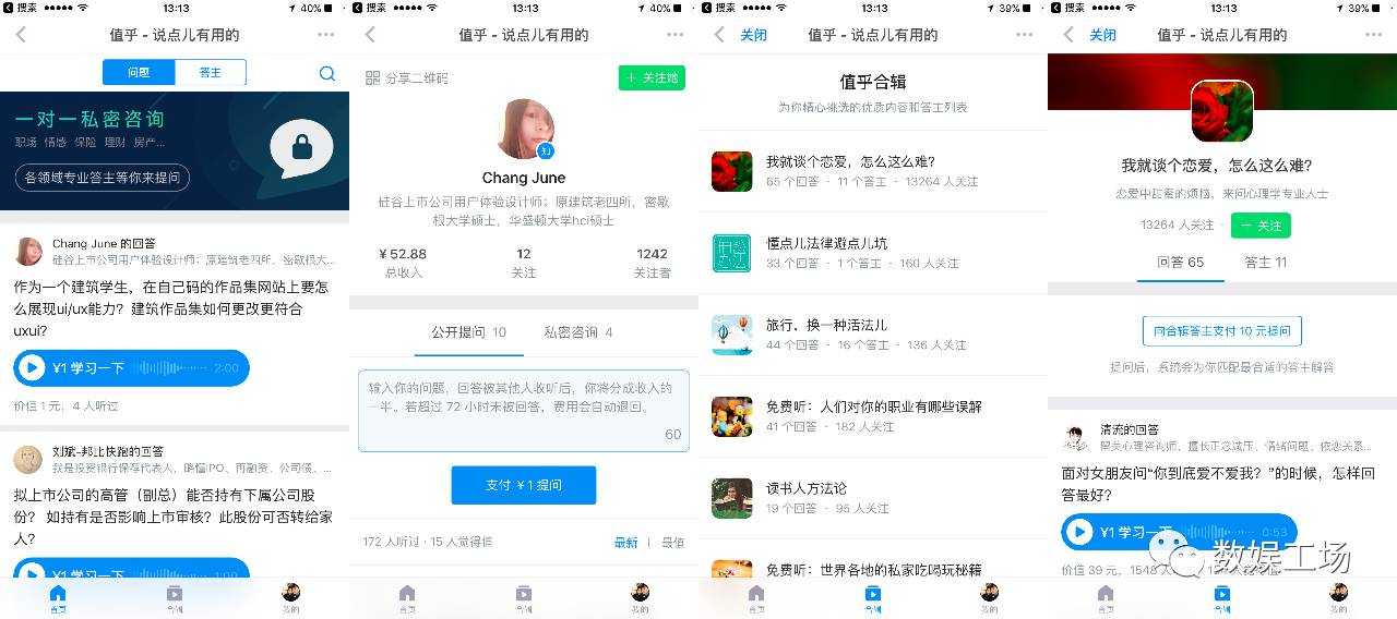 与“靠我”及在行的问答模式不同,分答将大V的回答限定在60秒语音之中,非标准化的问答流程在形式上被固定下来,大V的回答以音频内容的形式沉淀在APP中,其它用户可以付费偷听,完成对内容的二次消费,大V的知识价值有了规模化的可能。