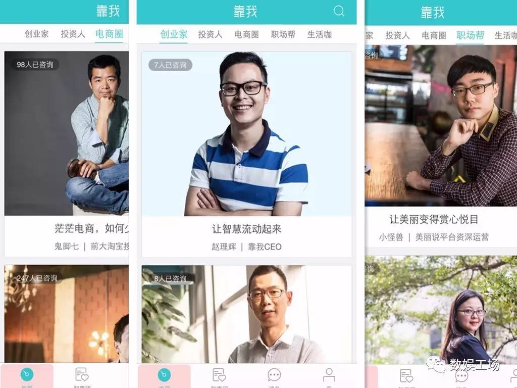 赵理辉是原阿里巴巴中国供应商市场销售总监,2014年创立“靠我”之初,自然而然选择了以电商类咨询为切入口,一边是淘宝操盘手、淘宝大学讲师等行业大V,一边是百万电商从业者,通过付费的图文语音或是电话,用户完成各自针对性的问答。