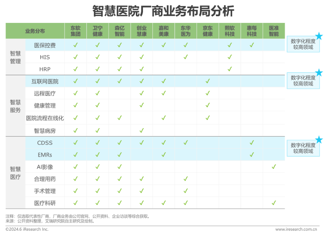 单一领域服务商、中型厂商、综合型厂商共同构建了智慧医院的行业生态,各自发挥着重要作用,为医院的智慧化发展提供多样化的选择。其中,综合型厂商能够提供涵盖智慧管理、智慧服务与智慧医疗的全方位解决方案,具备强大的系统集成能力和广泛的市场覆盖,是医院实现智慧化升级的最优选择。