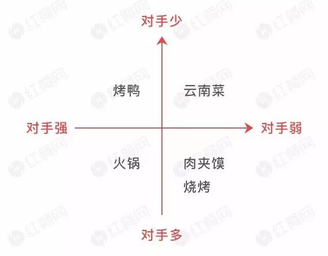 适合餐饮初创者的方法,选对手多,对手弱,不要选多少多,对手强的象限,因为对手多说明市场刚性需求大,对手弱说明市场没有老大,有创新及心智占位空间。