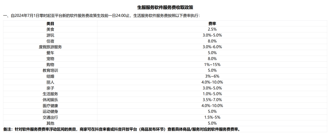 2022年5月,抖音发布《2022年生活服务软件服务费标准说明》,称“为建立可持续发展的生态,给商家提供更为优质的服务”,自2022年6月1日起对在抖音平台经营团购业务的生活服务商家收取佣金。其中,各商品类目的平均软件服务费率为3%,最高费率不超过8%;同时对新商家有60天的保护期,保护期内仅收取0.6%的支付通道服务费。以此为起点,抖音生活服务业务不再实施“普惠型”减免软件服务费政策,彻底告别“0佣金”时代。