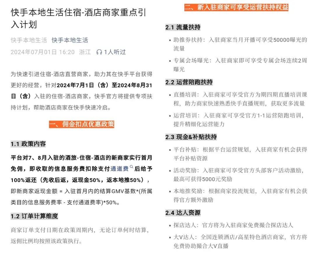 就在抖音生活服务开始执行全新佣金费率的同一天,快手本地生活发布面向住宿、酒店商家的重点引入计划。其中提到,“为了快速引进住宿-酒店直营商家,助力其在快手平台获得更好的经营”,将针对2024年7月1日至2024年8月31日期间入驻的该类目商家,提供专项扶持计划。