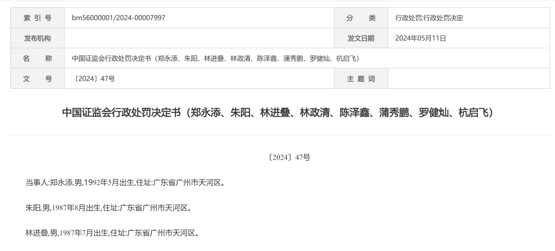 证监会的处罚,也主要集中在郑永添身上,其一人就承担了1827.77万元,林进叠、林政清、朱阳等人次之。