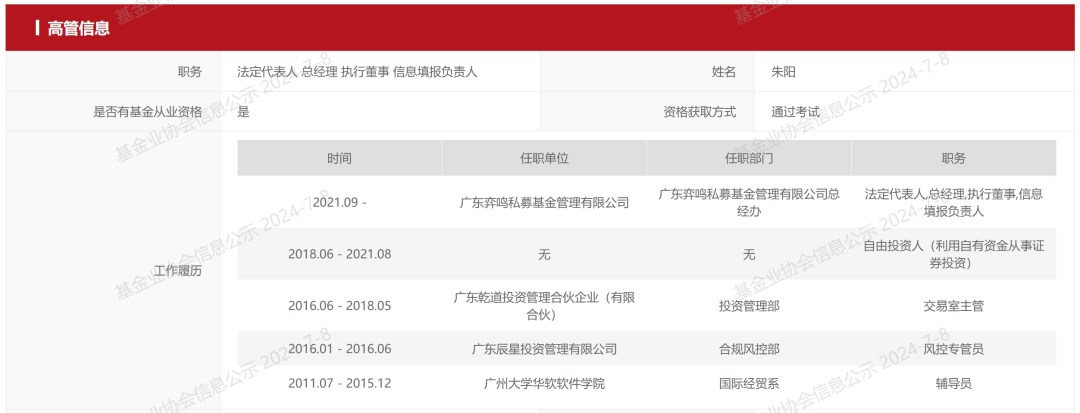 仅6个月之后,朱阳又成为了广东乾道投资私募公司投资管理部的交易室主管。工商资料显示,辰星投资和乾道投资的实控人都是范青松。