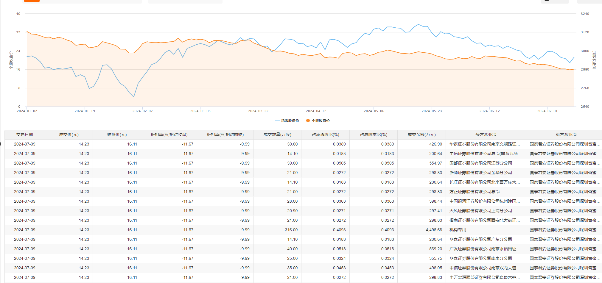 七一二7月9日大宗交易成交660.2万股,成交额9394.64万元,占当日总成交额的34.96%,成交价14.23元,较市场收盘价16.11元折价11.67%。