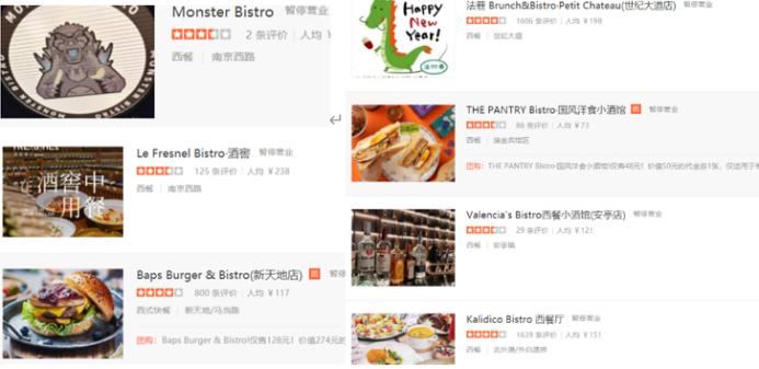 在上海,目前大众点评显示“暂停营业”的bistro就有近20家,同样的现象还发生在北京、广州等地方。