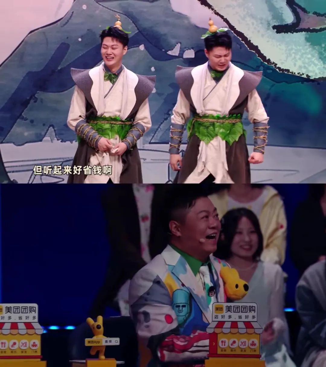 《葫芦兄弟》的二娃本想安慰丢葫芦的七娃弟弟,岂料拥有顺风耳的他走神听热闹咕哝出一句“美团团购”,机灵的七娃立马对接上颗粒度——“不知道哥你在说什么,但听起来好省钱啊”!