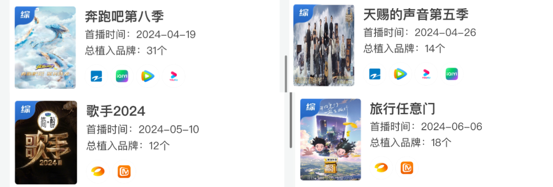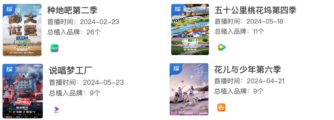 再者,上半年植入数量较多的网综还有——腾讯视频的《五十公里桃花坞第四季》(11个品牌);爱奇艺的《新说唱2024》(10个品牌)、《萌探探探案第四季》(10个品牌);优酷的《说唱梦工厂》(9个品牌);芒果的《花儿与少年·好友记》(9个品牌)、《爸爸当家第二季》(9个品牌)和《乘风2024》(8个品牌)。