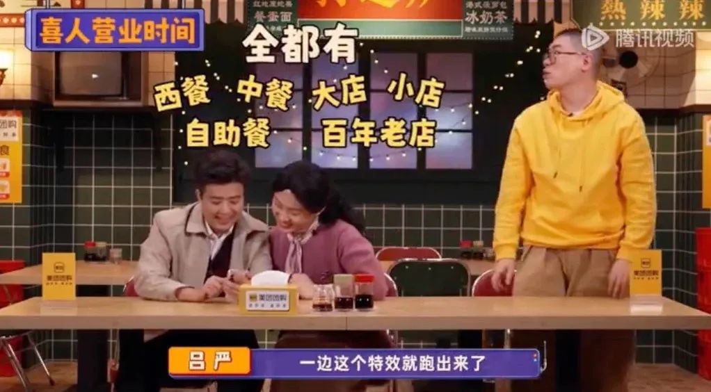 以上片段出自《喜人奇妙夜》首期某作品,巧借一个设定系包袱向观众抖出美团省钱的产品卖点,这种next level的高段位植入思路,在如今的综艺界比比皆是。