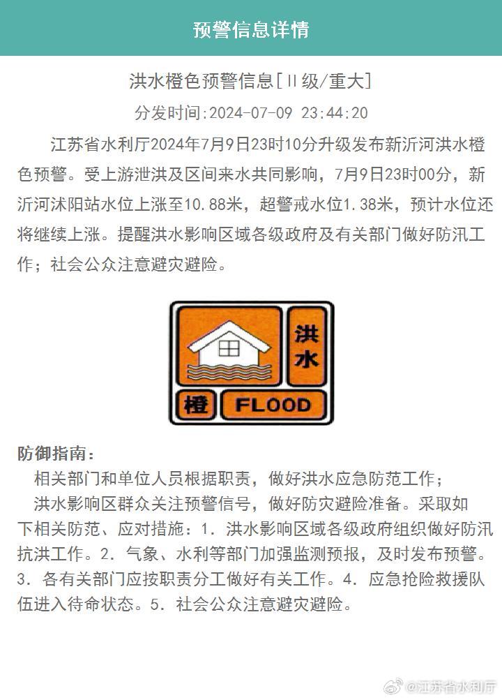 江苏省水利厅2024年7月9日23时10分升级发布新沂河洪水橙色预警。受上游泄洪及区间来水共同影响,7月9日23时00分,新沂河沭阳站水位上涨至10.88米,超警戒水位1.38米,预计水位还将继续上涨。