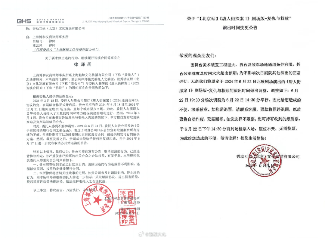 左:魅鲸文化律师函;右:秀动互娱演出时间变更公告