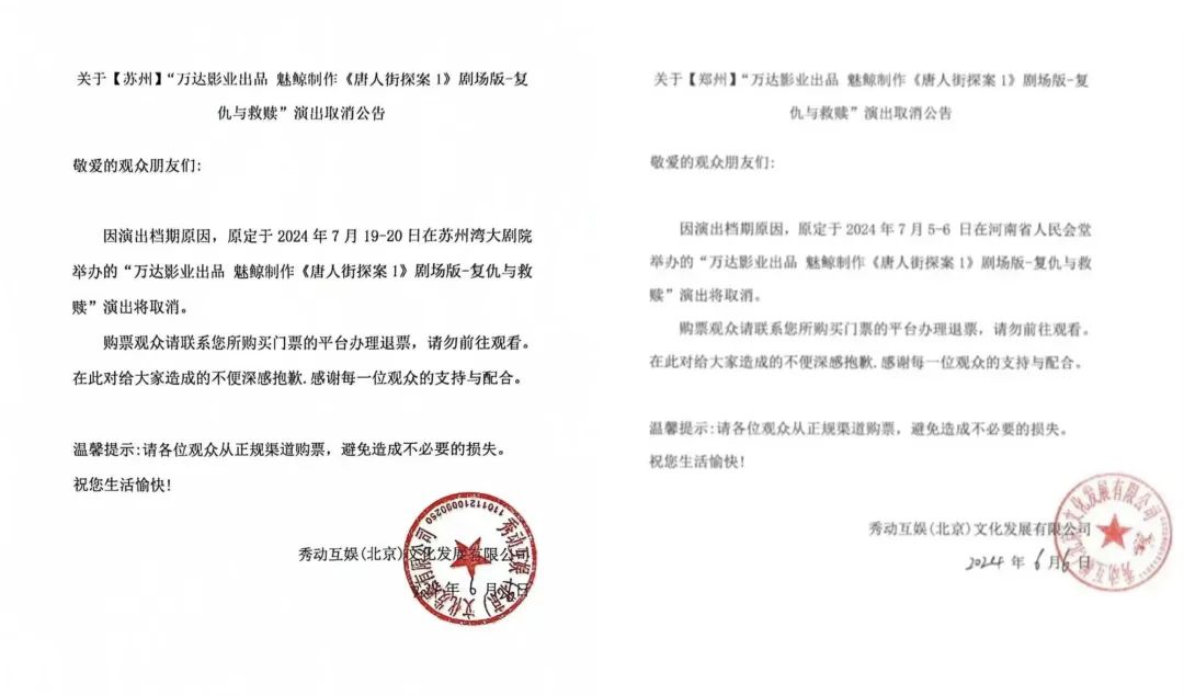 6月16日,秀动互娱发出了一份演出时间变更公告,公告透露:“因舞台美术装置工程巨大,拆台及装车场地通道条件有限,拆台装车难度及时间大大超出预期;为不影响次日剧院其他演出的正常进行,无奈我们将原定于2024年6月22日北展剧场演出的《唐人街探案1》剧场版-复仇与救赎的演出时间做出调整”,表示6月22日19:30的场次将调整为6月22日14:30。