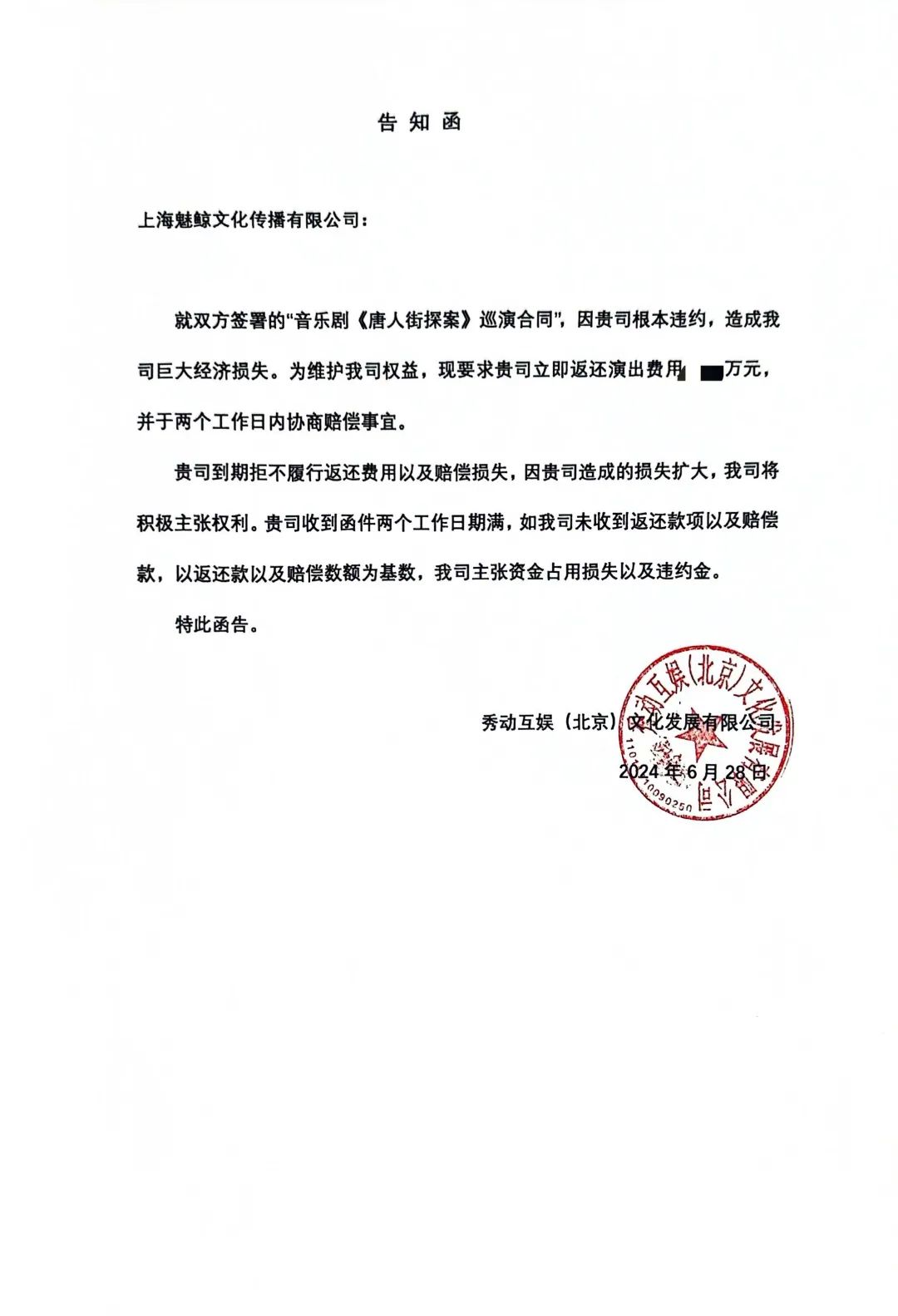 近日,一份律师函进入了音乐财经的视野,由上海博和汉商律师事务所受上海魅鲸文化传播有限公司(以下简称为:魅鲸文化)委托,向秀动互娱(北京)文化发展有限公司(以下简称为:秀动互娱)发出的公开声明。律师函中,魅鲸文化控诉秀动互娱违背协议约定,在未与音乐剧制作方魅鲸文化确定的情况下,先单方面宣布取消《唐人街探案1》音乐剧巡演的陕西站和郑州站,随后又单方面宣布取消剩余所有场次,这构成了严重的合同违约。