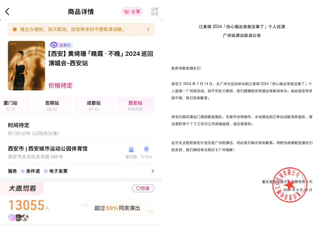 本月初,黄绮珊的“晚霞·不晚”2024巡回演唱会西安站及杭州站发布了延期公告,原定于7月14日在广州声音共和Livehouse举办的,江美琪“伤心唱出来就没事了”巡演宣告取消,乐迷们纷纷打抱不平,黄绮珊和江美琪都是实力型唱将,热爱唱歌、也有非凡的歌唱能力,值得更好的市场反馈。