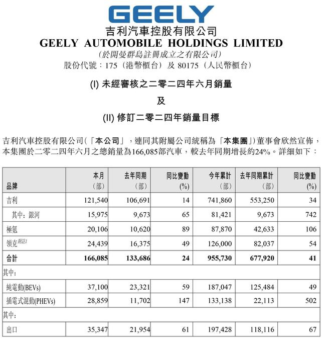 吉利汽车(0175.HK)上半年累计销量95.57万辆,同比增长41%,再创新高;其中,新能源汽车销量为32.02万辆,同比增长117%。