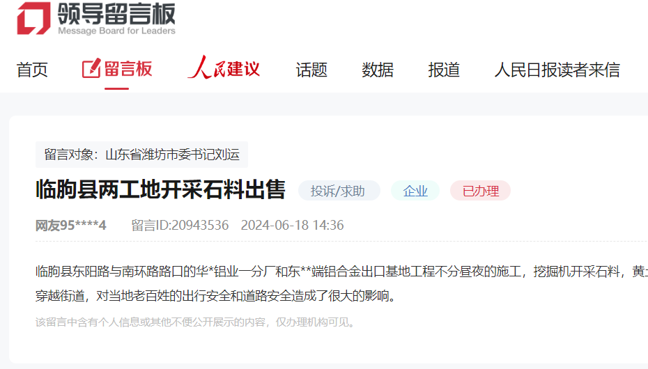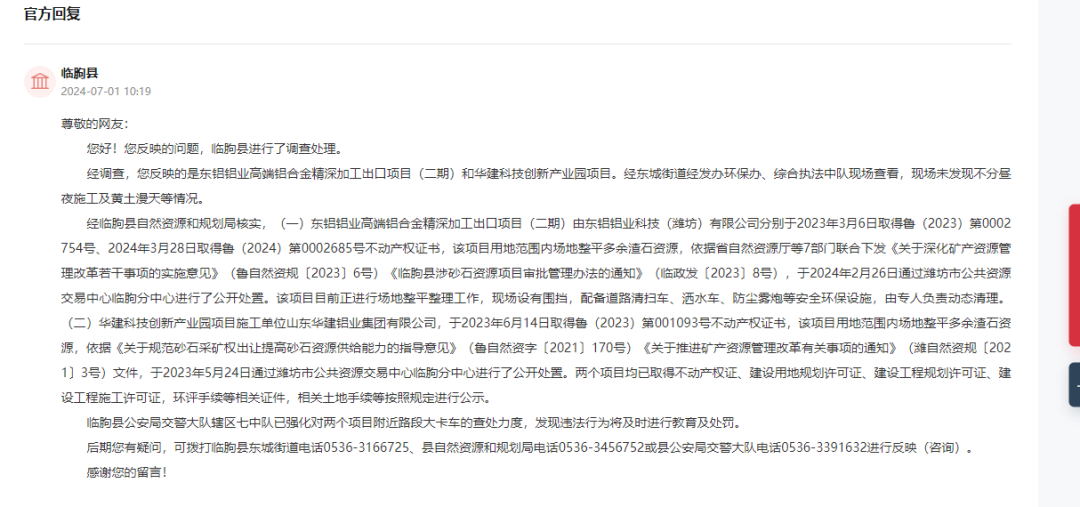 针对该网友的反映,临朐县官方进行了调查处理,并在留言板进行了回复。“经调查,您反映的是东铝铝业高端铝合金精深加工出口项目(二期)和华建科技创新产业园项目。经东城街道经发办环保办、综合执法中队现场查看,现场未发现不分昼夜施工及黄土漫天等情况。”据临朐县官方回复内容,经临朐县自然资源和规划局核实,东铝铝业高端铝合金精深加工出口项目(二期)由东铝铝业科技(潍坊)有限公司分别于2023年3月6日取得鲁(2023)第0002754号、2024年3月28日取得鲁(2024)第0002685号不动产权证书,该项目用地范围内场地整平多余渣石资源,依据省自然资源厅等7部门联合下发《关于深化矿产资源管理改革若干事项的实施意见》(鲁自然资规〔2023〕6号)《临朐县涉砂石资源项目审批管理办法的通知》(临政发〔2023〕8号),于2024年2月26日通过潍坊市公共资源交易中心临朐分中心进行了公开处置。该项目目前正进行场地整平整理工作,现场设有围挡,配备道路清扫车、洒水车、防尘雾炮等安全环保设施,由专人负责动态清理。