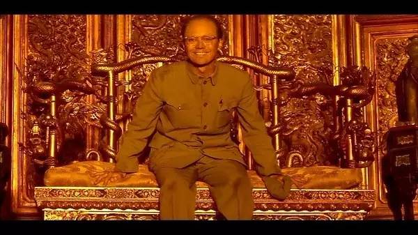 溥仪轻快地爬上台阶,坐在龙椅上开心地露出微笑,并招呼小红卫兵上去。