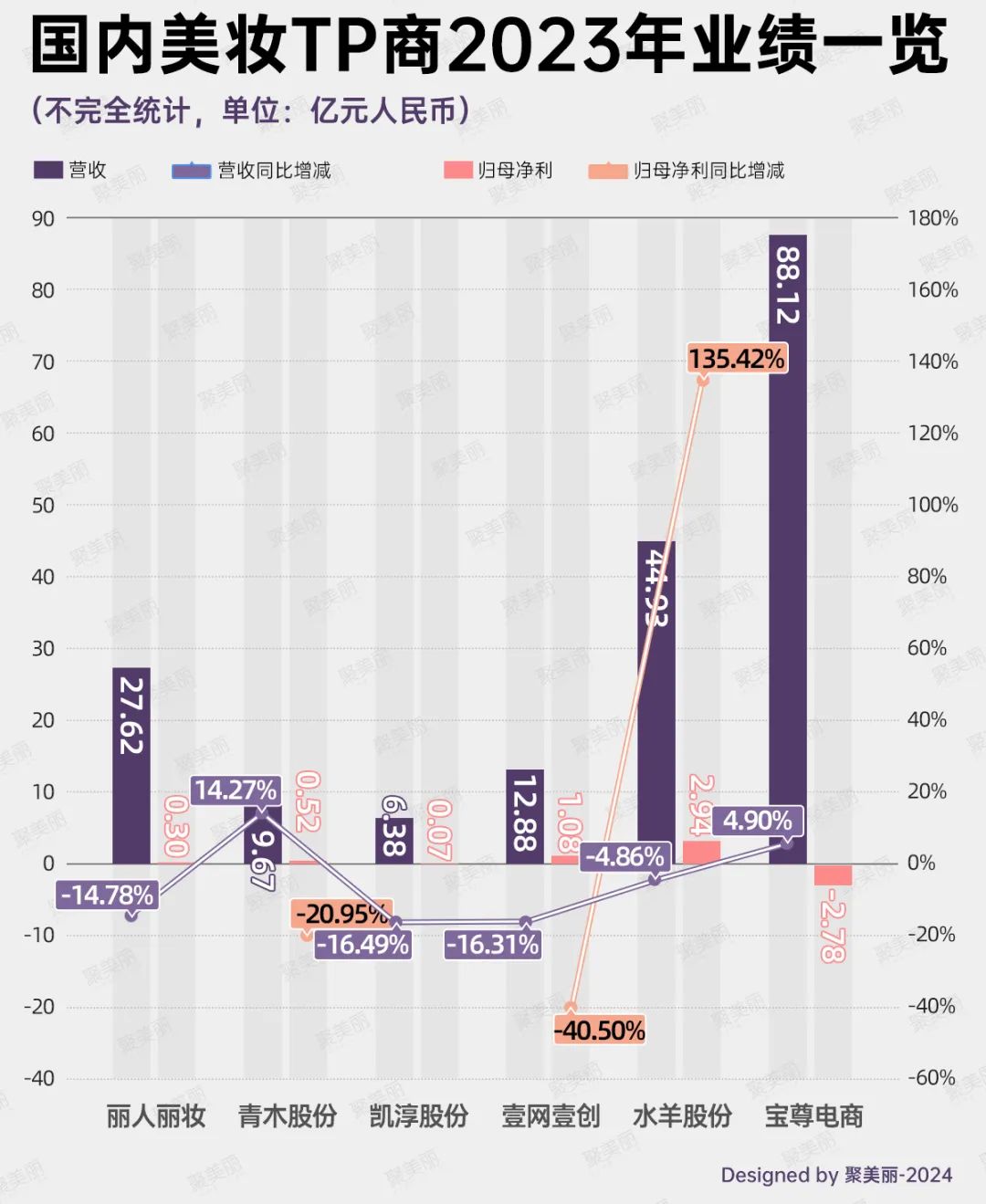 从国内美妆行业来看,高浪控股的状况,实际上是整个TP商行业的缩影。就2023年业绩来看,当下国内美妆TP商普遍存在盈利难的困境,如宝尊电商还持续亏损,亏损数额近3亿元。